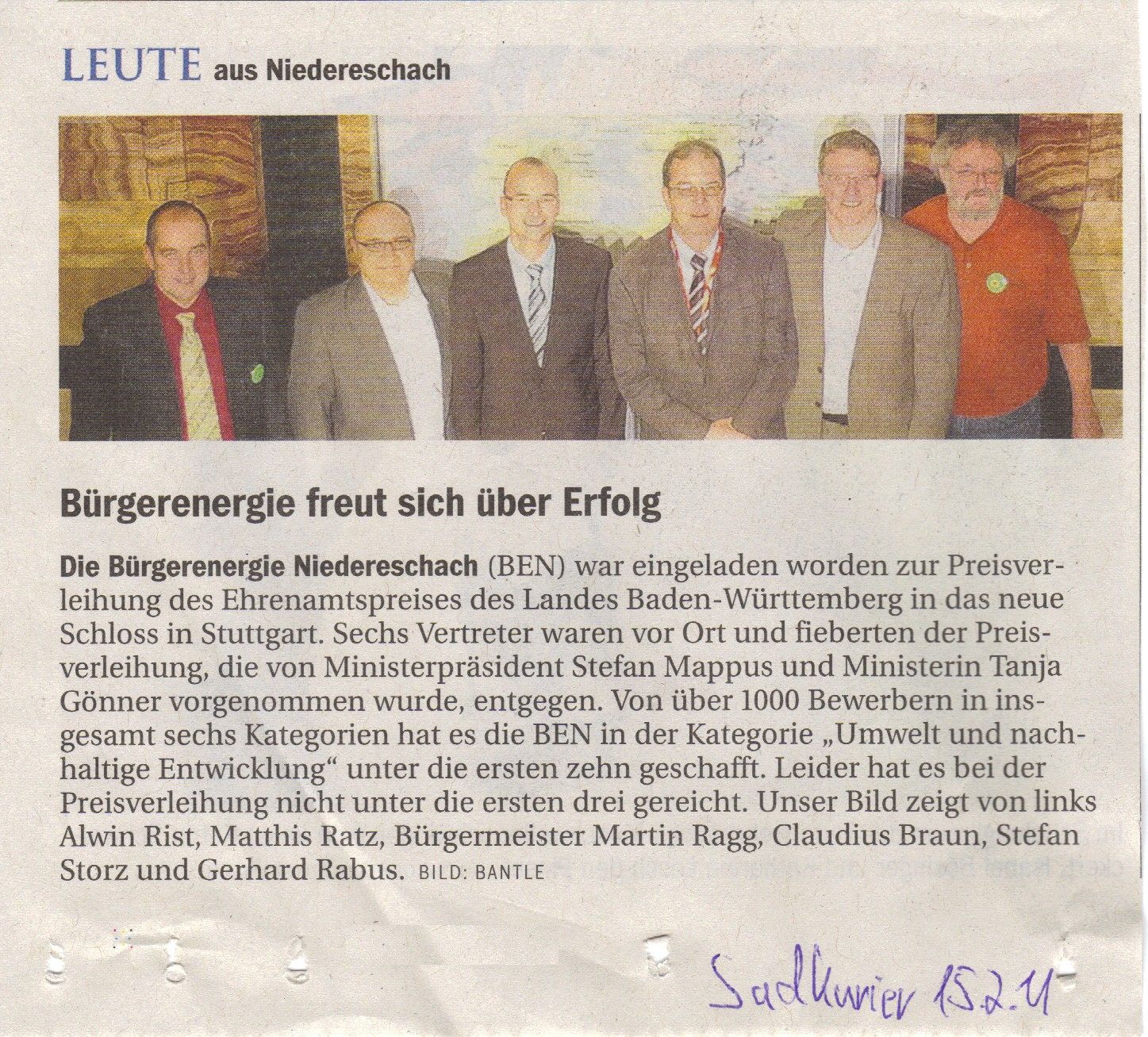Die BEN ist in der Kategorie "Umwelt und nachhaltige Entwicklung" nominiert. Die Preisverleihung findet im Neuen Schloss in Stuttgart statt. BEN erreicht einen Platz unter den Top Ten von 1.000 Bewerbern.