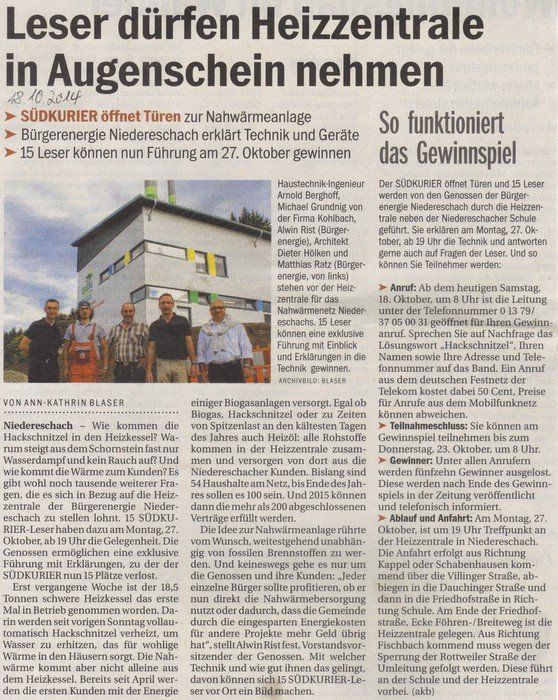 15 Leser des Südkurier konnten am Montag 27. Oktober um 19 Uhr eine Führung in der BEN Heizzentrale gewinnen. Dazu mussten sie bis Donnerstag 23. Oktober 8 Uhr einen Anruf tätigen und das Lösungswort "Hackschnitzel" sowie Ihren Namen und Telefonnummer nennen. Unter allen Anrufern wurden die Gewinner ausgelost. Treffpunkt war die Heizzentrale in der Friedhofstraße 12 in Niedereschach.